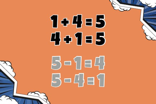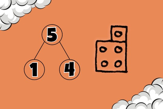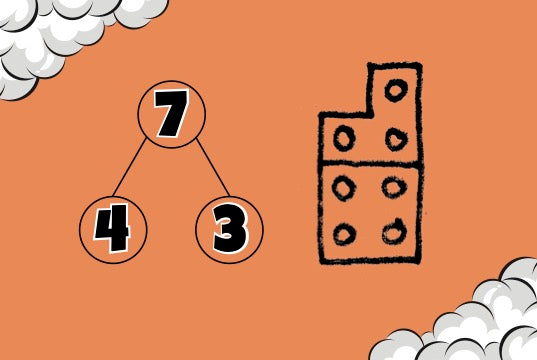 Orangene Karten: Hier werden die Zahlendreiecke mit Legostein-Formen und der mathematischen Schreibweise kombiniert. So lernen die Kinder in einer Kombination aus handelndem und schriftlichem Rechnen, die Mengen bis 10 sicher zu handhaben.