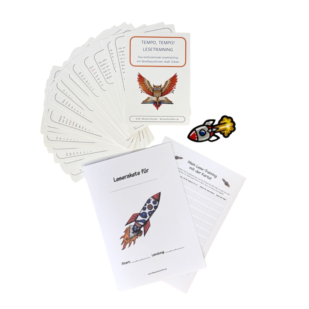 Diese Lesekartei im Postkarten-Format hilft Ihrem Kind, flüssig lesen zu lernen, seinen Wortschatz zu erweitern und den Aufbau von Wörtern zu verstehen. Außerdem können Sie sie für Nachschriften und Diktate verwenden. Wenn Ihr Kind sein Tempo-Ziel erreicht hat, erhält es das beiliegende Raketen-Badge als Belohnung (z.B. auf die Jacke aufbügeln).